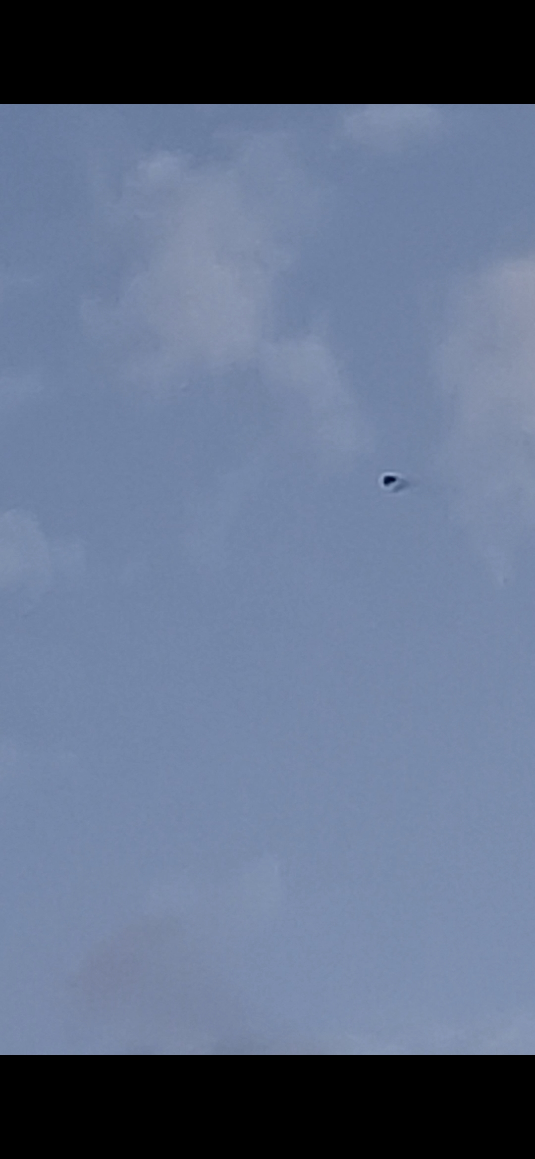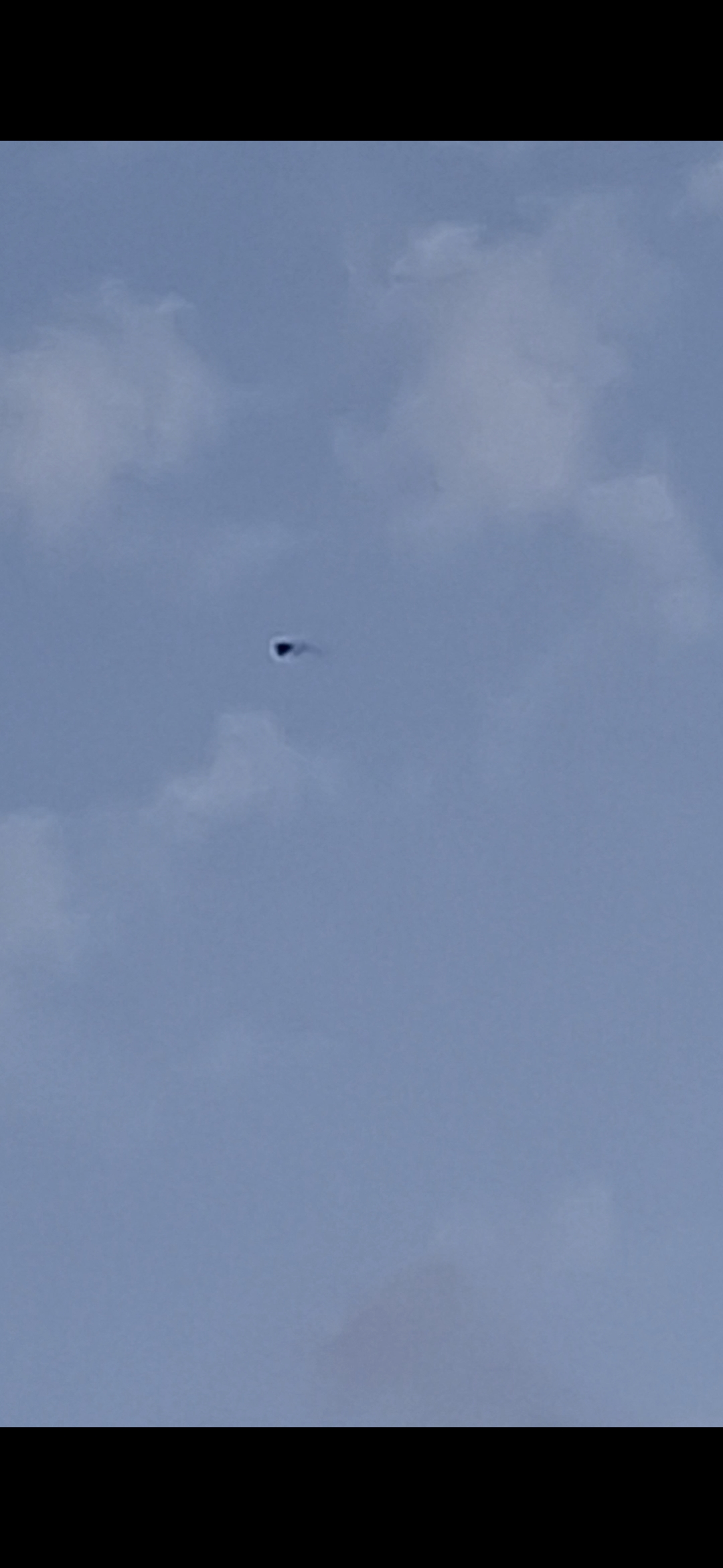 AMERSFOORT, UT — Volledig zwart klein driehoekje dat soms lichtelijk van vorm veranderde als vleugelslag, maar op zo'n manier dat het duidelijk geen (roof)vogel was (dan waren er ook andere kleuren te zien geweest), constante snelheid (ongeveer 15 km/h schat ik zo), constanste hoogte (ongeveer 60-70 meter hoog, roofvogelvluchthoogte), volledig stil. Toen ik hem filmde, werd er op camera ineens een kleine brandstroflucht achter zichtbaar. Niet te zien in het echt.