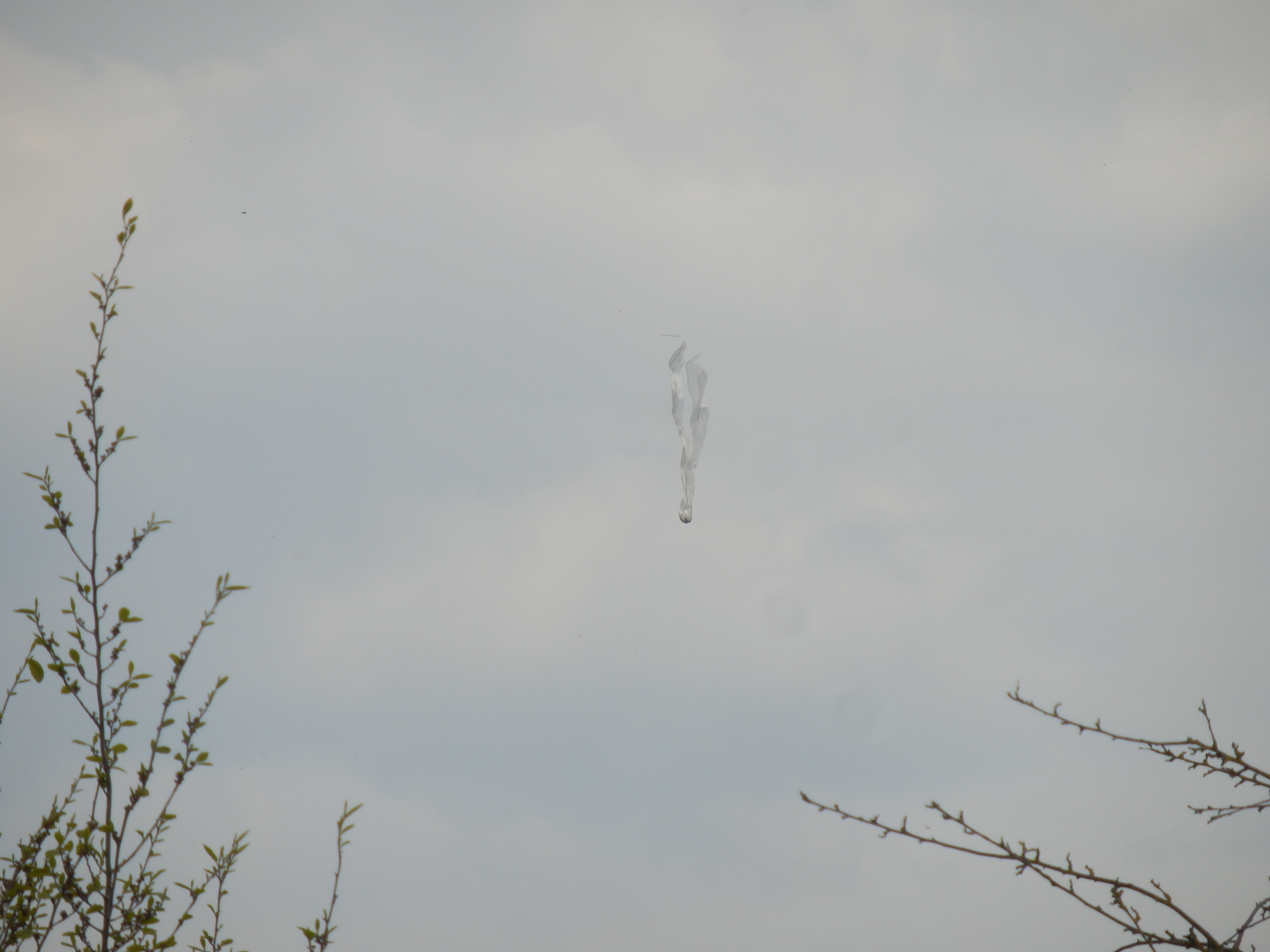 Het object bewoog zich vallend naar de grond op grotere afstand. Moeilijk in te schatten deze afstand. Misschien plaats Boekel. Zie bijgaande foto's. De witte stoffen aan de bovenzijde wapperden als vlaggen. Zie redelijk goed in te zoomen foto's. Misschien een kapot gegane weerballon, vliegbasis Volkel? Ik roep maar wat.