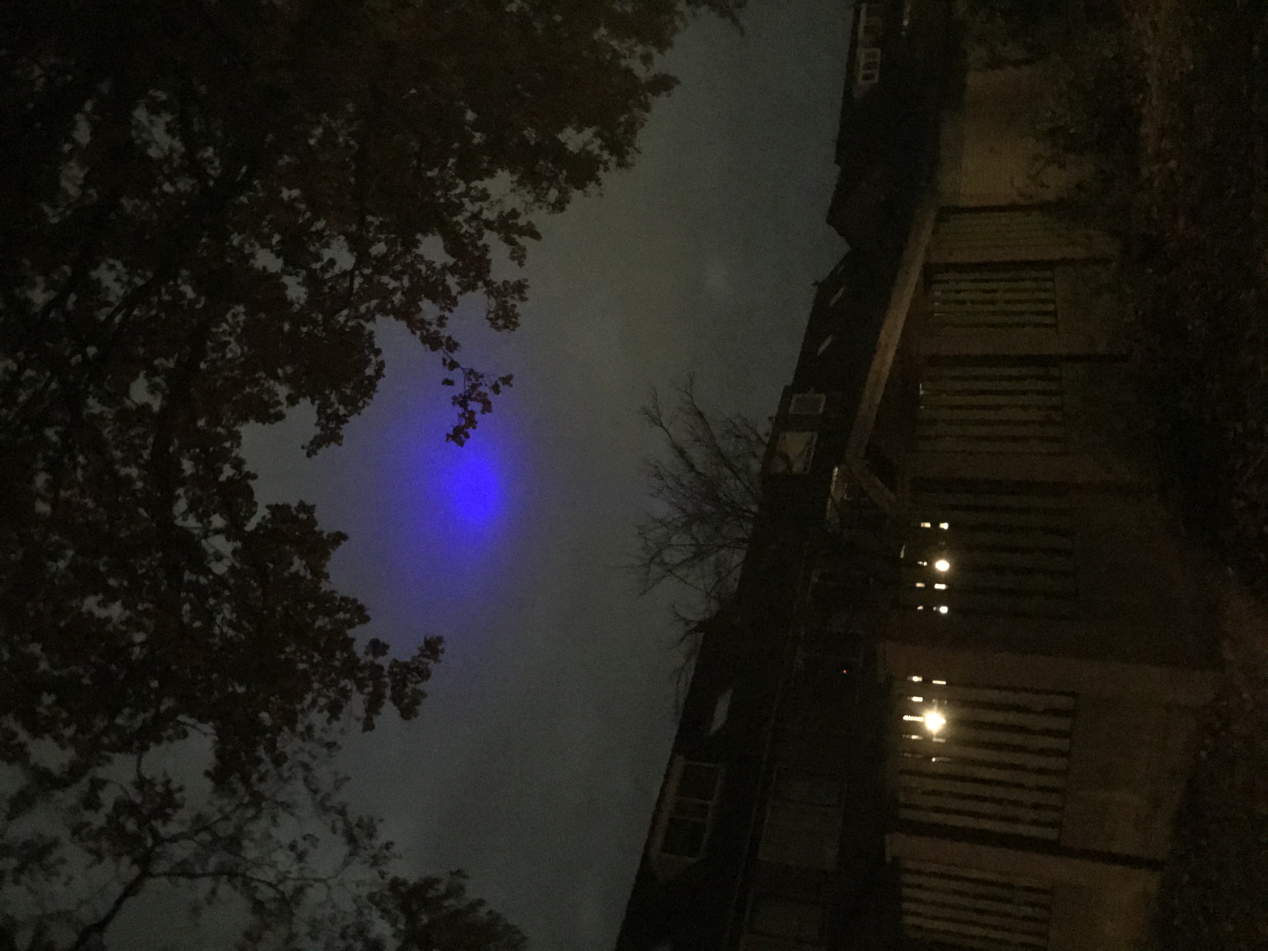 Om 1.00u afgelopen nacht ging ik de hond uitlaten en zag vanuit het noordwesten een blauwe gloed. Ik ben hierop gaan letten en het bewoog ongeveer net zo snel als een vliegtuig maar veel lager en zonder geluid richting het zuiden.