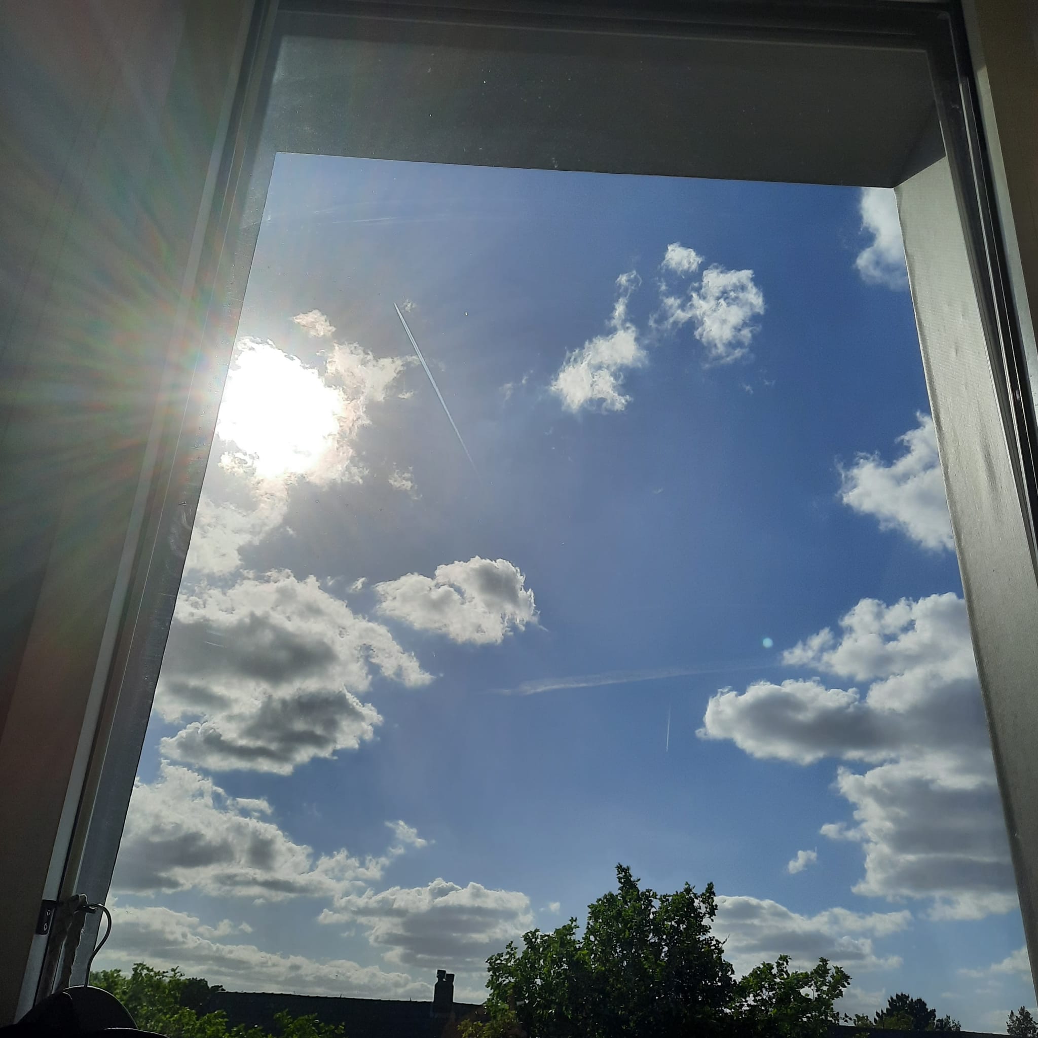 Een stilstaand bolvormig object in blauw wolkendek. Ik zag het pas later op de foto die ik heb genomen vanuit mij dakraam van de wolken afgelopen vrijdag om 18.00 uur.