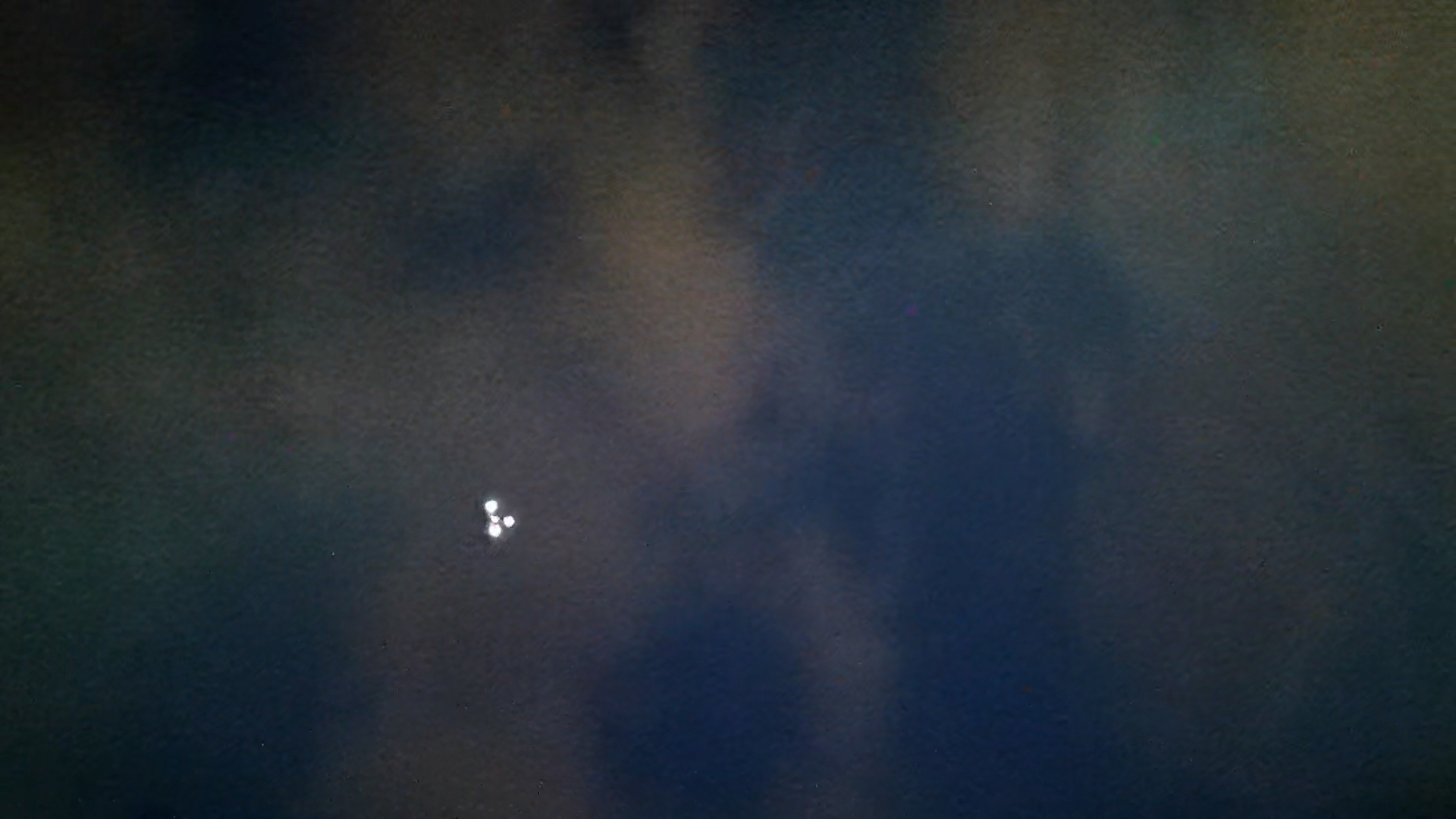 GRONINGEN, GR — Drie lichtgevende schijven in een driehoekformatie. Geen idee hoe groot het was. Ik denk de driehoek had een grootte van een Boeing 747. In het midden van de formatie vloog iets met rood licht. Maakte geen geluid. De foto's zijn frames van het filmpje die ik gemaakt heb. Het object was ongeveer 25 seconden te zien toen het zicht geblokkeerd werd door het dak van het huis.