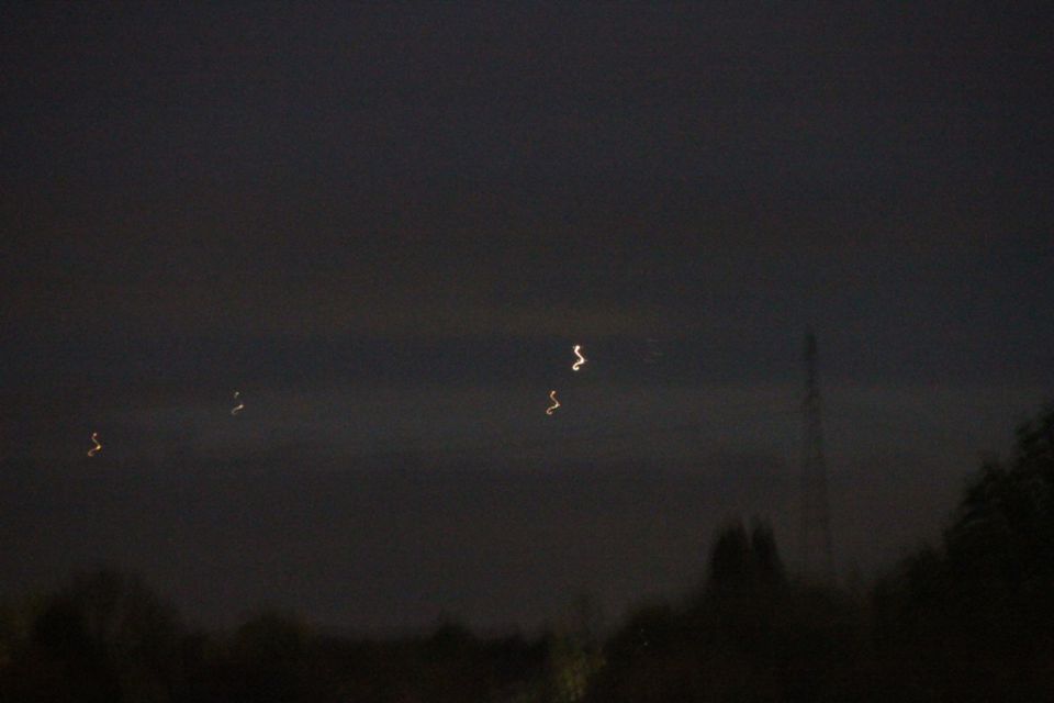 BERKENWOUDE, ZH — Ca 4 felle witte lichten die feller en minder fel werden met daarom meerdere kleine lichten. de felle lichten verplaatsen zich constant over de noordoostelijke hemel van links naar rechts en van rechts naar links. soms knipperden ze als vliegtuigen. lange tijd hingen ze stil dan ineens gingen ze met een flinke snelheid langs de hemel. vanaf krimpen aan den ijssel gezien in de richting van de lijn gouda-schoonhoven. vanuit lekkerkerk en bergambacht waren ze ook in die richting te zien. het geheel duurde ruim een uur.