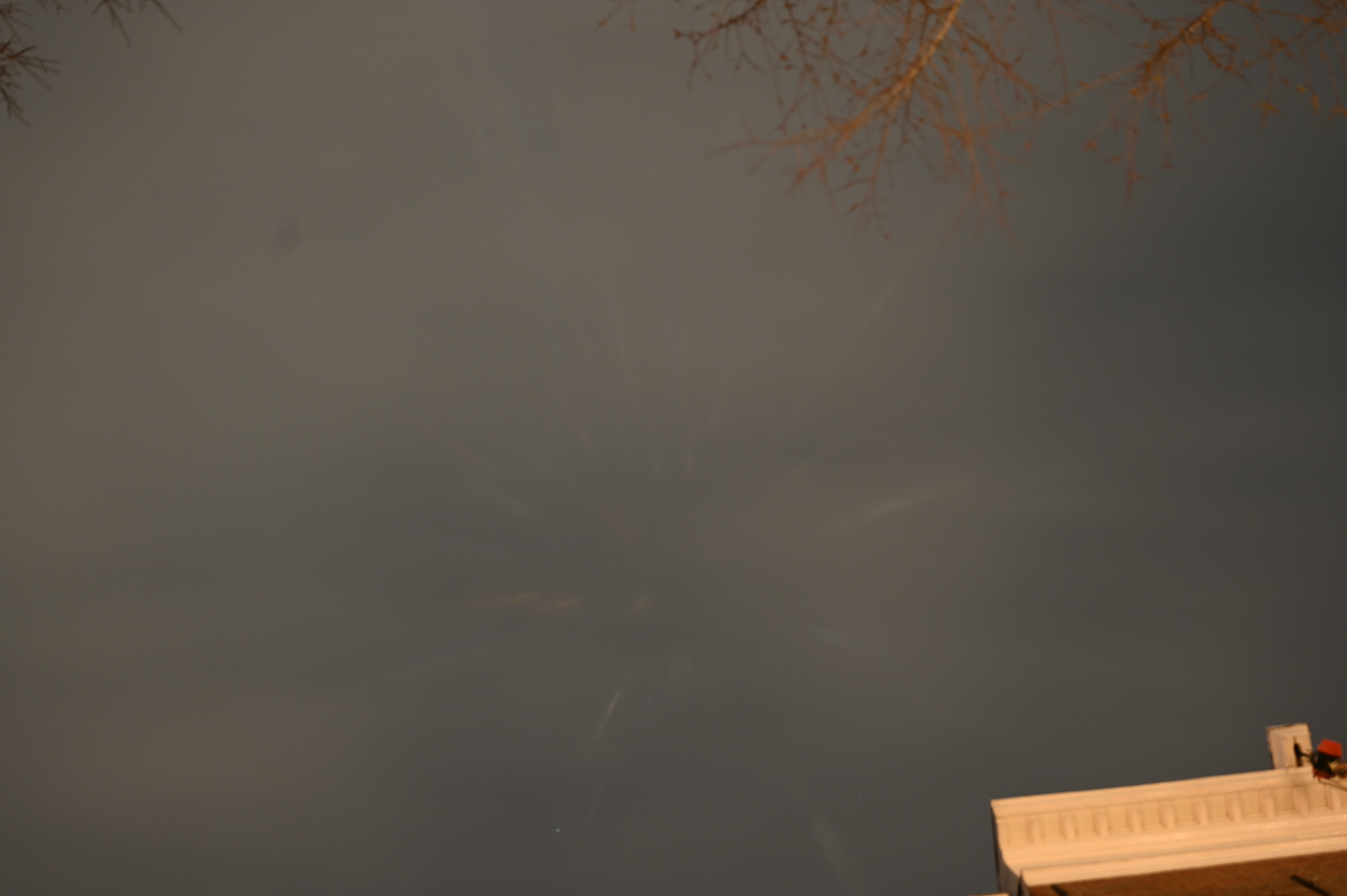 AMSTERDAM, NH — Een stilstaande ontploffing van een aantal vage lichtstrepen, recht boven het hoofd met het blote oog te zien. Een lange sluitertijd foto laat tientallen individuelen strepen zien, allemaal afkomstig van hetzelfde punt. Ook zijn twee kleine stippen te zien, misschien zijn dit sterren. Het was erg bewolkt. Waarschijnlijk een ontplofte UFO
