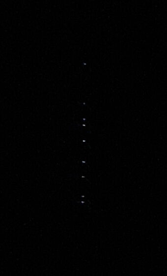 ELSPEET, GD — Ik zag gisternacht iets dat lijkt op een doorzichtige balk, met daarin tien lichtpunten op ongelijke afstand. Volgens mij is dat het Starlink satelliet-systeem. Ik heb het nu voor het eerst op foto. Ik zag hem ook vannacht rond 1.10u, recht boven mij, het ging van zuidwest naar noordoost.