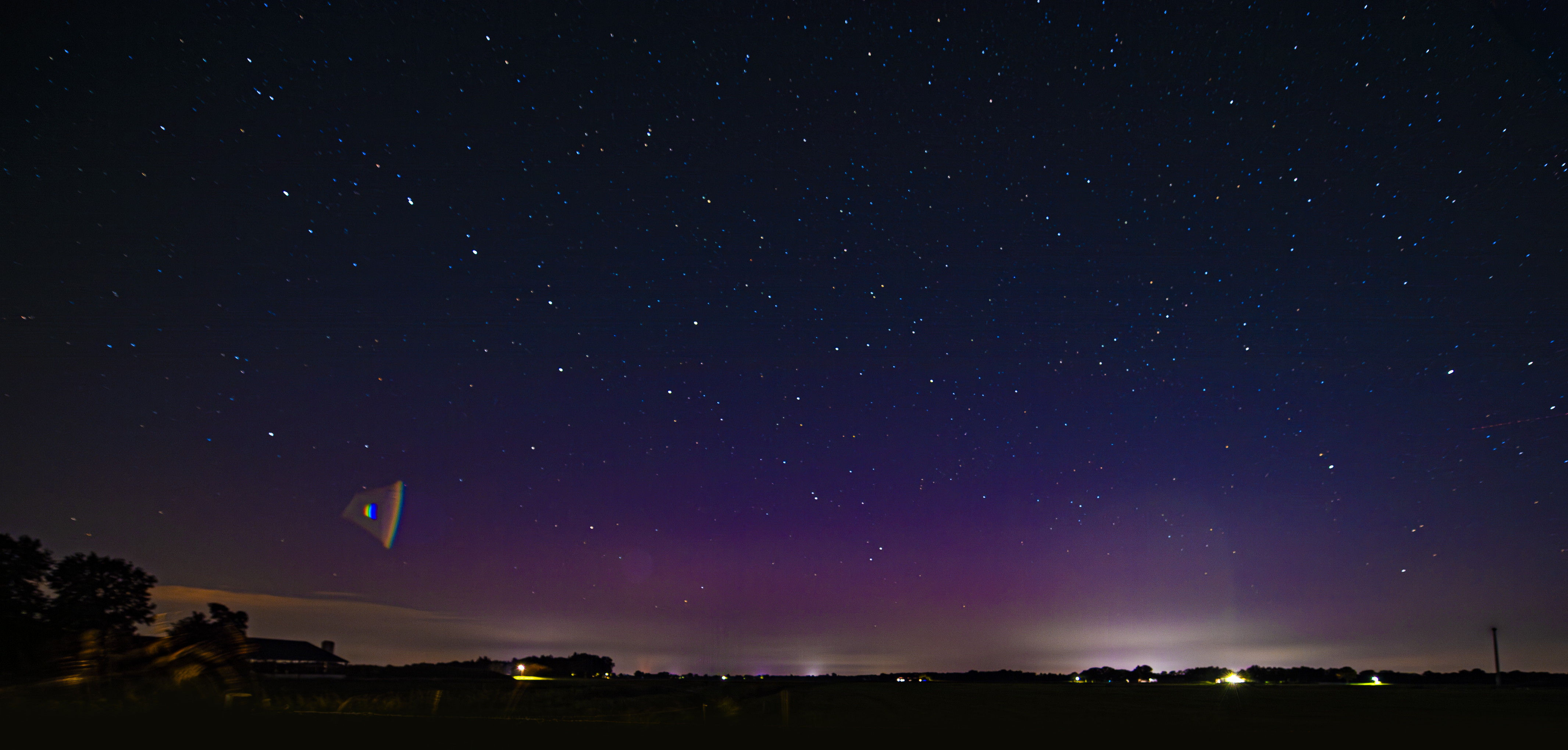 Er zit een heel lichte lensflare in de foto, bijna niet zichtbaar. Het object is wel heel goed zichtbaar. Ik heb geen gebruik gemaakt van flitslicht of een andere lichtbron. Op de andere foto's (hier zal zo'n minuut telkens tussen zitten) is niets te zien. Het was helder weer, maar wel heel donker