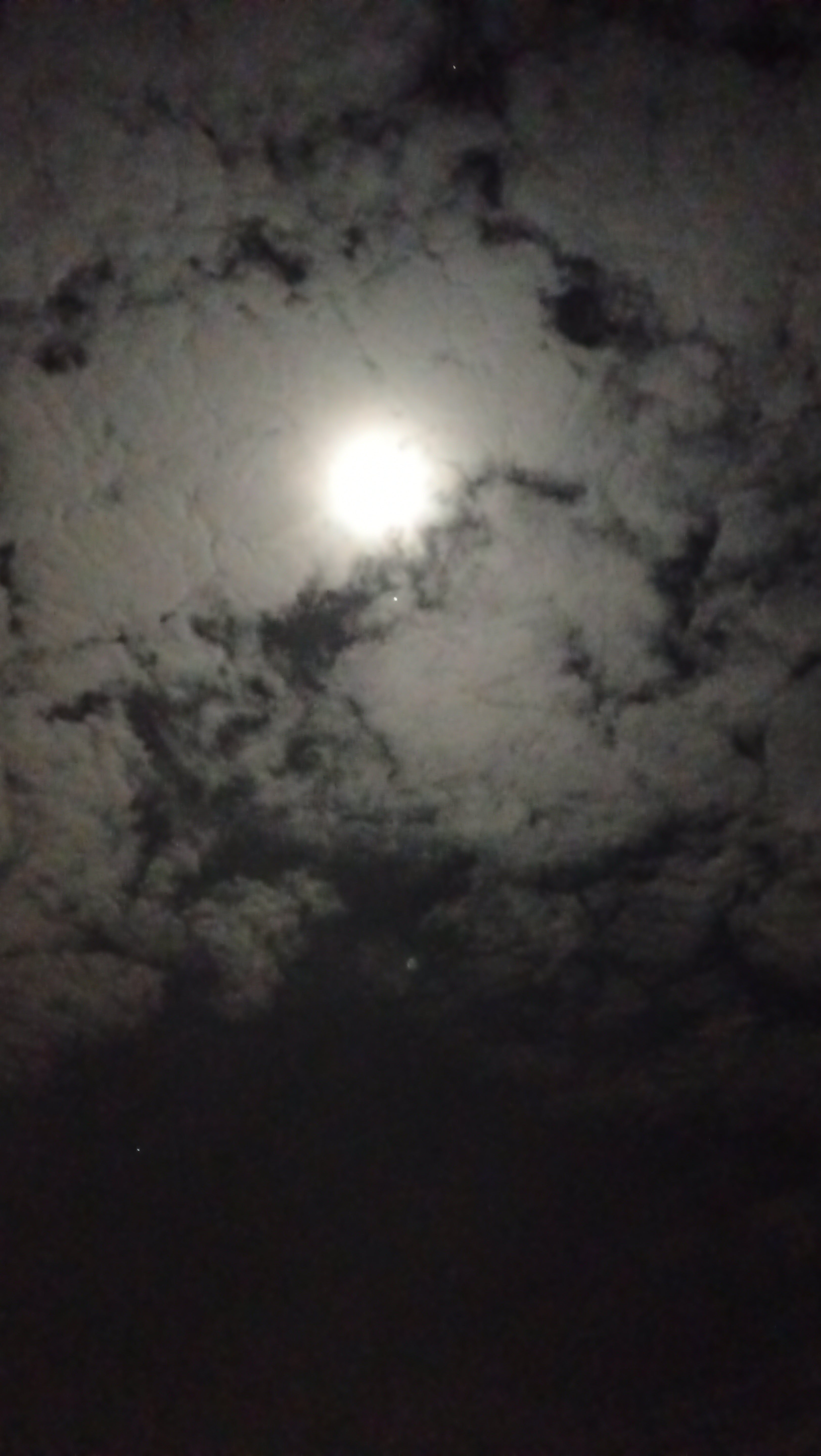 Na 10 min lopen met de hond nog steeds rond de maan voor de wolken.