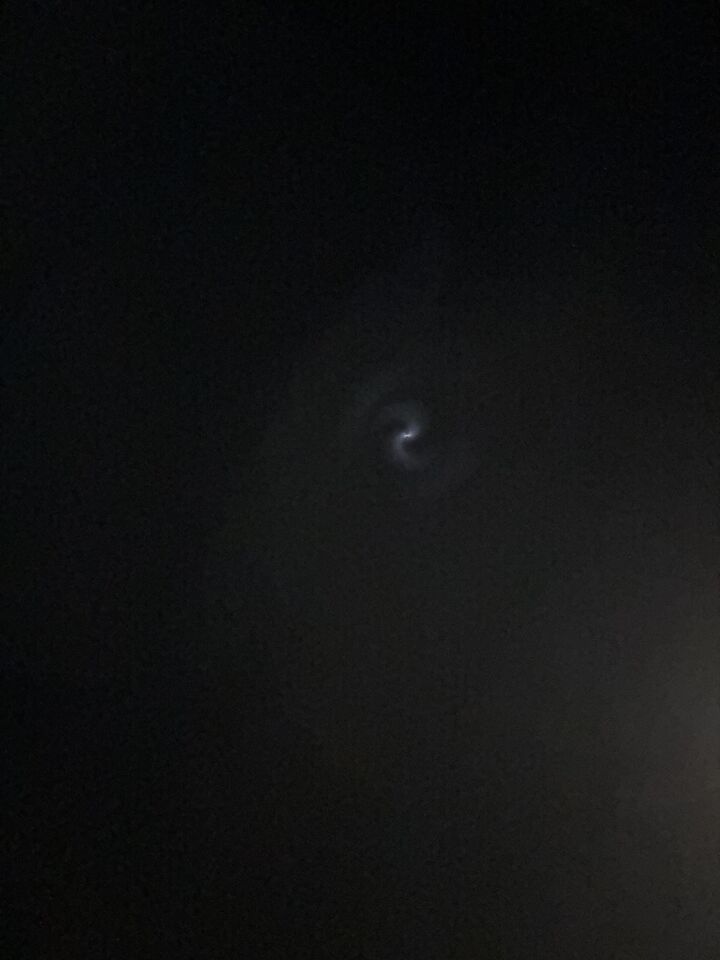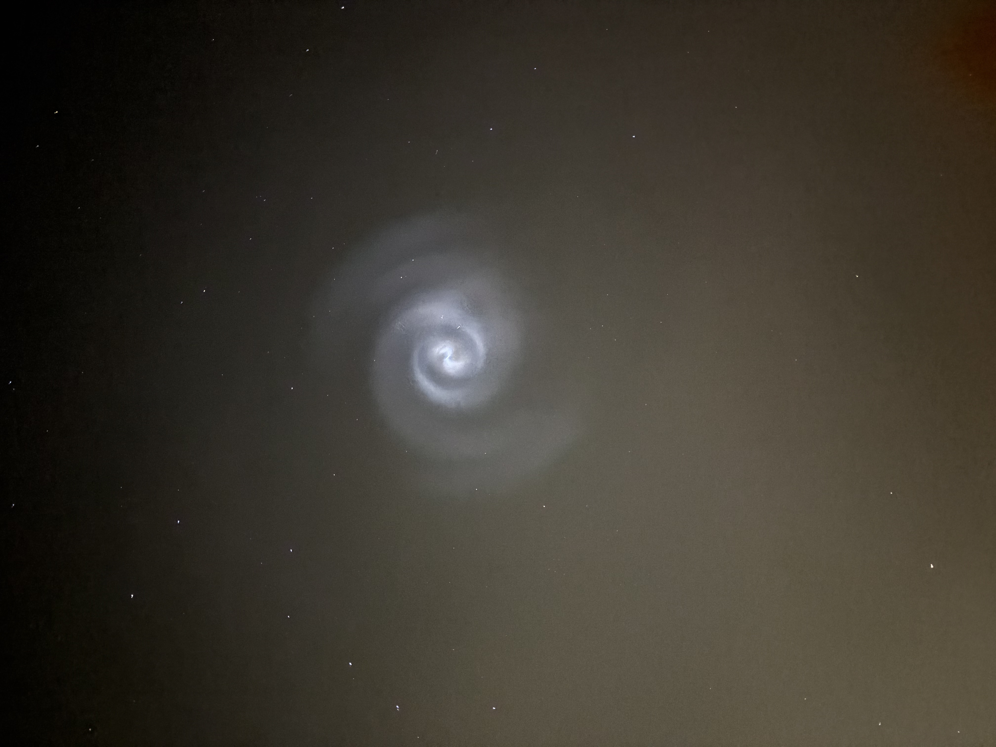 Het gaat om een brandstofdump van een SpaceX raket. De spiraal ontstaat doordat de gedumpte brandstof rondtolt en verdampt. Die damp bevriest, en de ijsvlokken weerkaatsen licht. Meer…