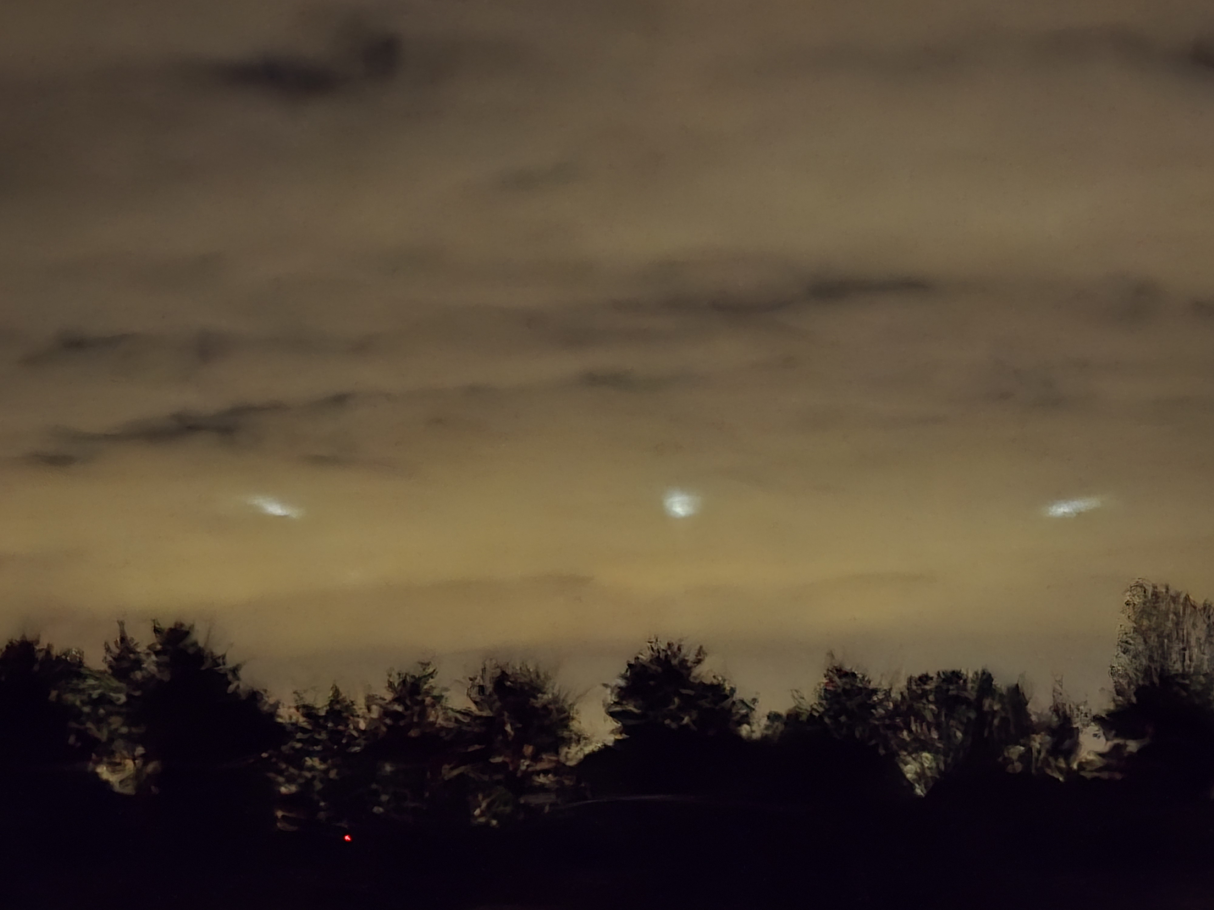 BEESD, GD — Witte lichtvlekken precies op linie. Het leken eerst schijnwerpers, maar het leek achter de wolken te zitten en ze vervormden. Na een minuut of 8 werden het platte lange strepen en verdwenen ze. Een minuut later was er nog eentje en die werd feller en minder fel. Daarna werd het een langgerekte streep en was het weg. Er was niets te horen, het leven lichten van achter de wolken. Ik heb een ingezoomd foto van 3 lichten en een video van het laatste licht, maar die kan ik niet uploaden.