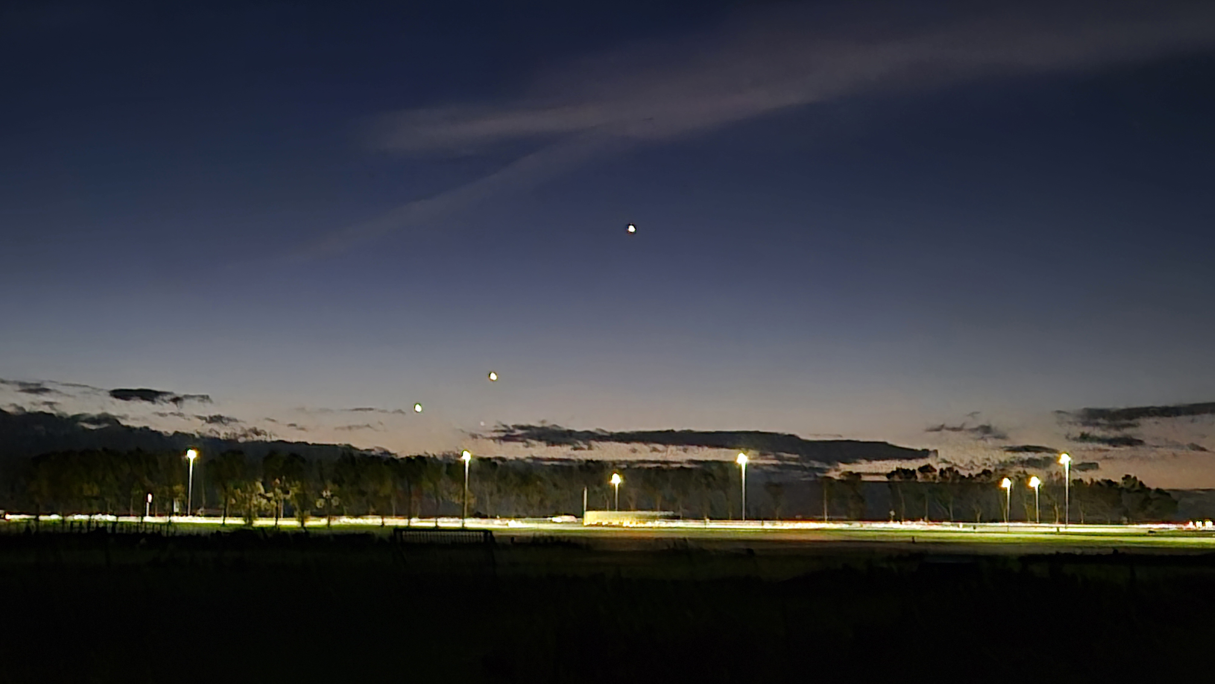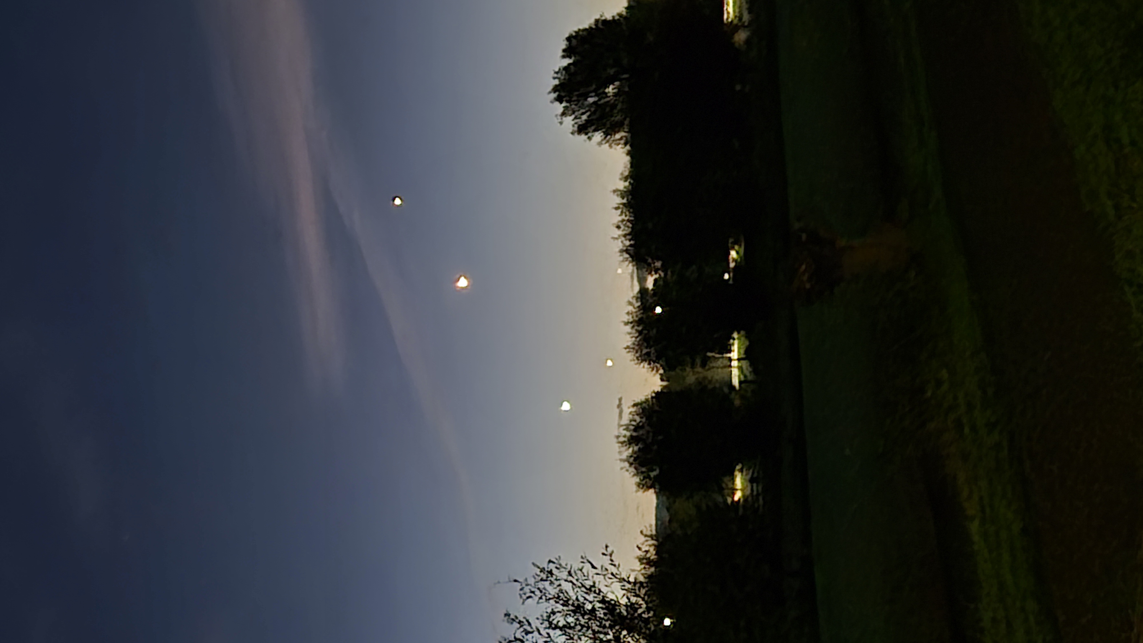 UITGEEST, NH — Mijn collega Mariëlle Verhoeven loopt sinds ze een hond heeft, gedurende 6 jaar 's morgens vroeg ongeveer dezelfde ronde, waarbij ze, als het weer het toelaat, vliegtuigen ziet komen en gaan, richting Schiphol. Op de bewuste ochtend op 9 oktober zag ze een rij van drie lichten en dacht dat het vliegtuigen waren, zoals gewoonlijk. Toen ze echter even later weer op dezelfde lokatie stond, merkte ze dat er bijna geen verandering was te zien; alle drie lichtpunten stonden nog op bijna dezelfde plek. Een bekende van haar had het ook in de gaten. Er zijn twee foto's gemaakt door Mariëlle, met een tussentijd van drie minuten. (zie bijvoegd) Ze had nog telefonisch kontakt gezocht met haar man, die op de ambulance-dienst op Schiphol werkt en hem gevraagd of er misschien een issue was op Schiphol, waardoor vliegtuigen in de parkeerbaan moesten. Dat bleek niet het geval.