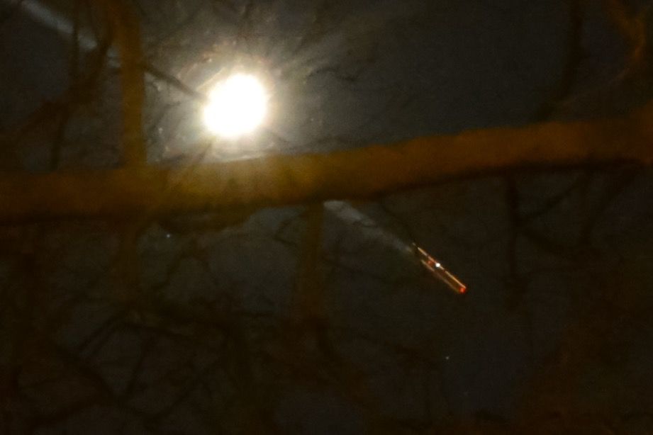 Ik was deze avond de sterrenhemel aan het fotograferen. De camera stond op selftimer, toen ik later de foto's terug keek zag ik een langwerpig object met twee rode lampjes. Heb het zelf Niet gezien of Gehoord, Alleen op de foto.