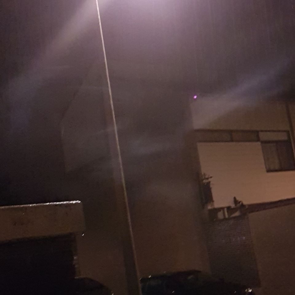 Ik wilde een foto van de regen maken, maar kreeg eem vage waas op de foto. Mijn lens was schoon. Het paarse licht aan de muur is een beveiligings camera. Wel zijn er ook vreemde verschijningen lager op de muur. Ik zag het ook pas toen de foto genomen was