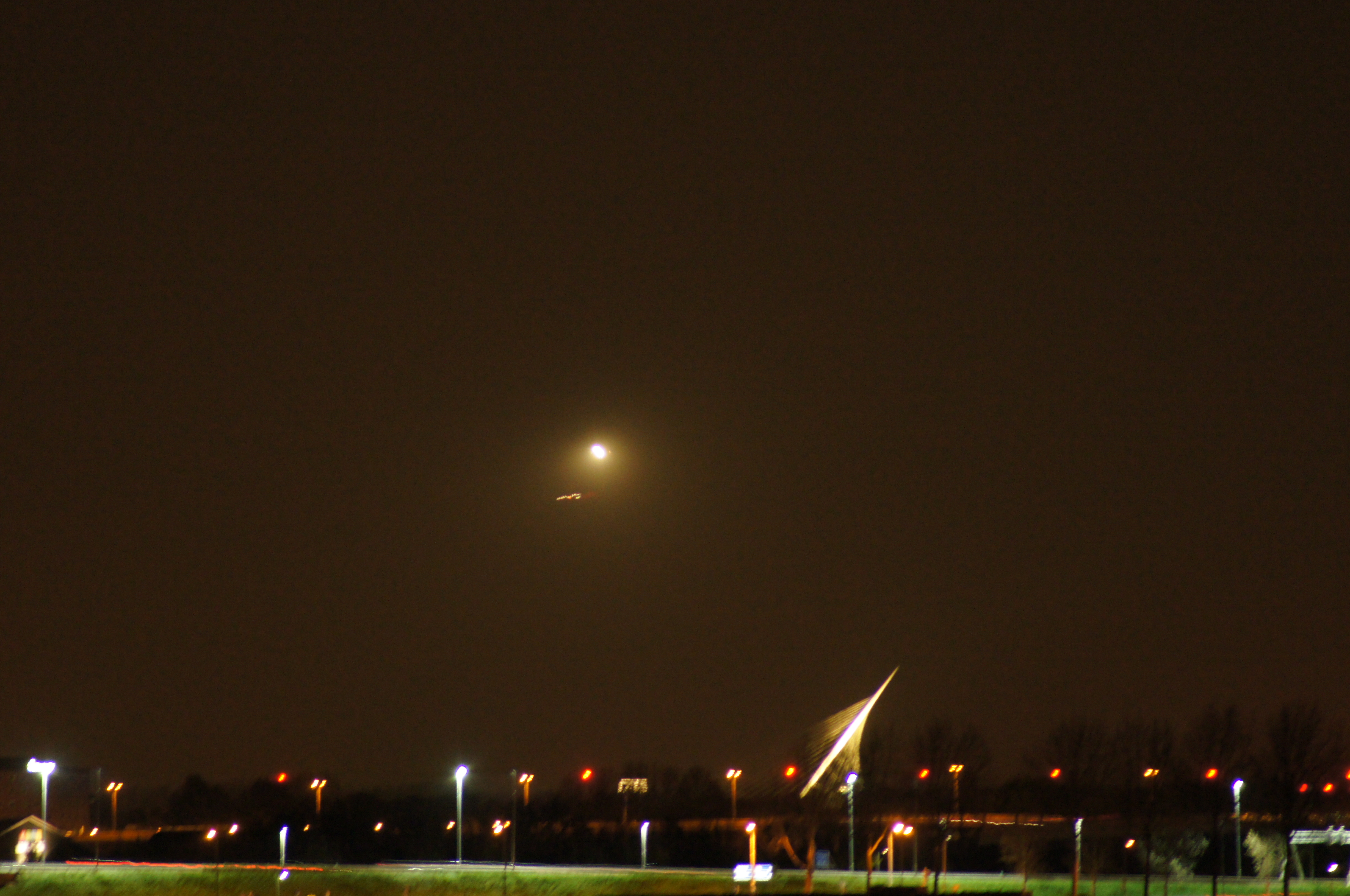 Ik keek uit mijn zonder raam toen ik 6 felle lichten zag die naast elkaar stil leken te hangen.