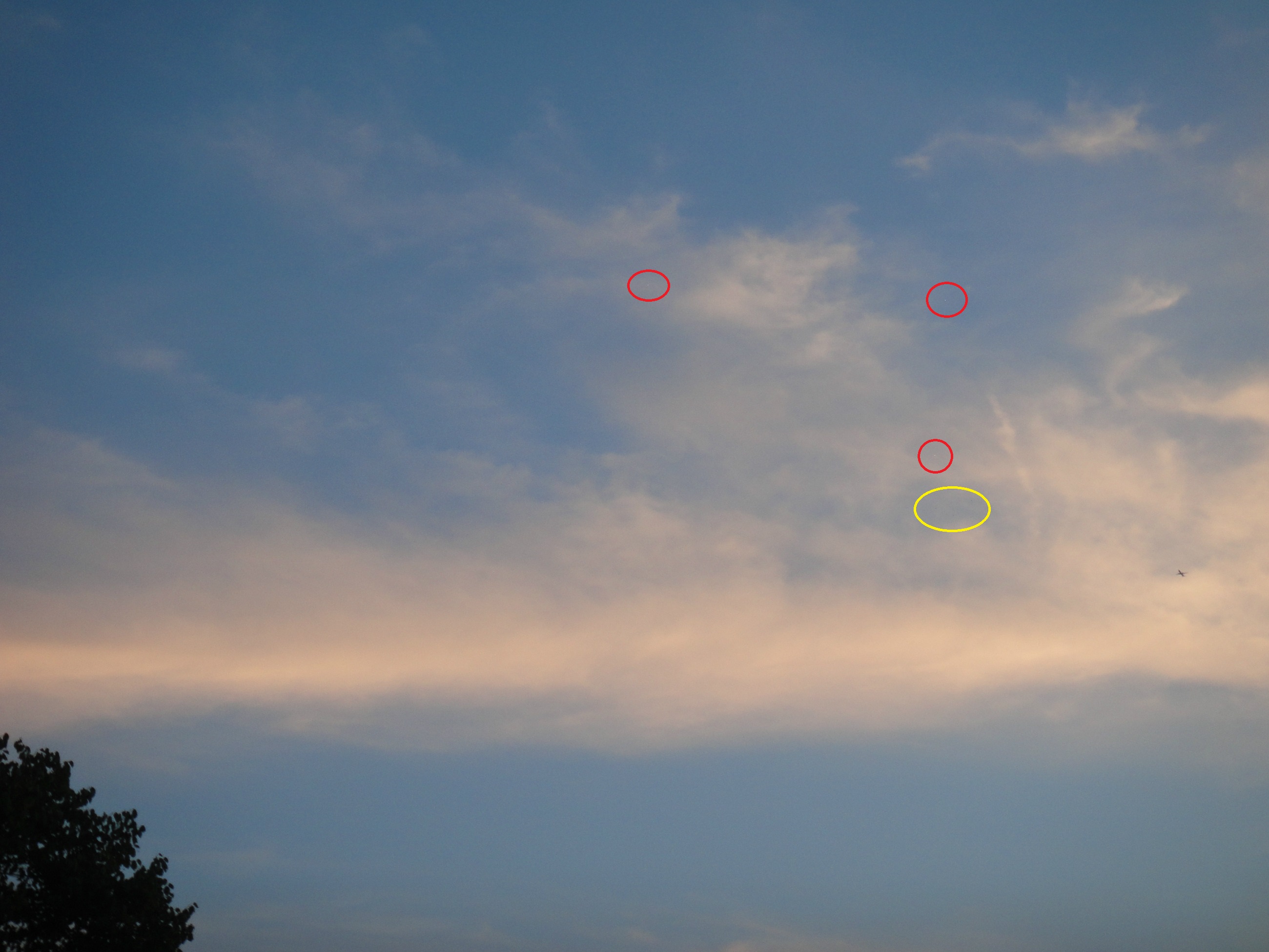 Gisteren 09-09-2018 Heb ik gewoon een paar foto's van de lucht gemaakt om mijn camera te testen. Bij het terug kijken van de foto's ondekte ik dit.! Van wat ik kan zien zijn het 3 lichtbollen ''objecten'' ver uit elkaar in de vorm van een driehoek. Verder zie ik drie donkeren objecten die naast/bij elkaar zweven. Verder niks gezien of gehoord dus zou verder niet weten hoe ze bewogen of wat ze deden, ik zag het pas terug op de foto. Foto 1. is de originele foto en foto 2. is ingezoomd. Tijd en datum van camera staat verkeerd ingesteld dus datum is niet correct met wanneer de foto is gemaakt.